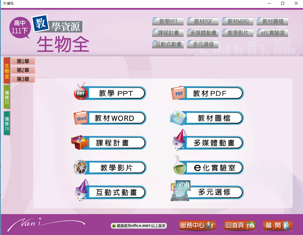 111學年下學期 高中大補帖 南一版 生物科(全、選修II、選修IV) 教學光碟